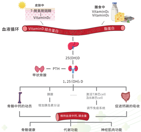 维生素D是一种源自胆固醇的类固醇激素,主要以维生素D2和维生素D3形式存在,通过维生素D结合蛋白(DBP)在血液中运输,活性维生素D与靶细胞维生素D受体(VDR)结合发挥生物学效应。VDR在体内多种靶器官组织中表达,如脑、心脏、皮肤、性腺、前列腺、乳房、胰腺、肾脏、肠道及骨骼等。维生素D经典作用是促进钙、磷在肠道中吸收,并抑制甲状旁腺素(PTH)释放,维持血钙和磷水平正常,进而保证骨骼健康和神经肌肉功能正常。其骨骼外作用包括对肌肉、心血管、代谢、免疫、肿瘤发生、妊娠和胎儿发育等多方面的影响。