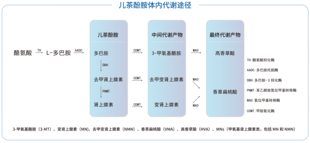 检测物质:肾上腺素、去甲肾上腺素、多巴胺、去甲变肾上腺素、变肾上腺素、3-甲氧酪胺、高香草酸、香草扁桃酸。