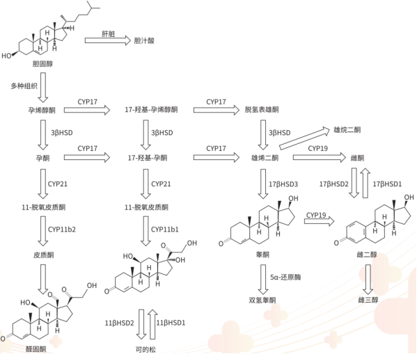 临床意义:类固醇激素类是临床检验和诊断常见和重要的生物指标,在维持生命、调节性功能,对机体发展、免疫调节、皮肤疾病治疗及生育控制方面有明确的作用。LC-MS/MS方法在临床中一项重要的应用是用于体内激素的检测,如类固醇激素(甾体激素)及其代谢产物的检测,具有重要的临床诊断价值,几乎可以诊断所有的类固醇相关障碍性疾病。人体类固醇激素的升高或者降低与一些临床疾病如先天性肾上腺增生、多囊卵巢综合症、肾上腺皮质功能不全等相关。因此,建立一种可以同时准确测定多种类固醇激素的分析方法对于临床疾病的诊断具有非常重要的指导。
