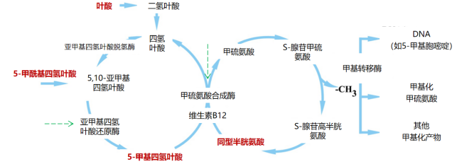 5-甲基四氢叶酸(5-MT):在同型半胱氨酸(Hcy)合成蛋氨酸过程中起甲基供体作用。5-MT间接为DNA甲基化和蛋白质甲基化提供甲基,降低体内Hcy水平。5-MT是叶酸人体血浆中主要的存在形式(>90%)。