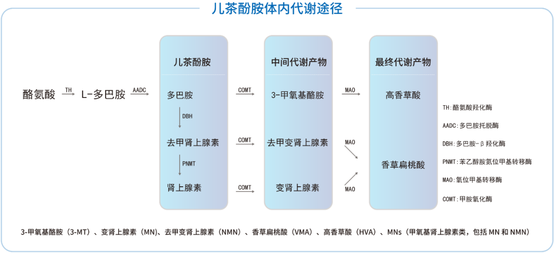 儿茶酚胺包括多巴胺(dopamine,DA)、去甲肾上腺素(norepinephrine,NE)和肾上腺素(epinephrine,E),一般称为儿茶酚胺原型物质,是存在于中枢和外周的神经递质或激素。这些神经递质参与多种调节系统和代谢过程,可作为多种神经内分泌和心血管疾病的筛查、诊断、治疗和预后的重要生物标志物。儿茶酚胺代谢物主要包括甲氧基肾上腺素(metanephrine,MN)、甲氧基去甲肾上腺素(normetanephrine,NMN)、3-甲氧基酪胺(3-methoxytyramine,3-MT)、高香草酸(homovanillic acid,HVA)和香草扁桃酸(vanillylmandelic acid,VMA),其与儿茶酚胺原型物质联合测量时,可以提供疾病发展和治疗效果的个性化信息。