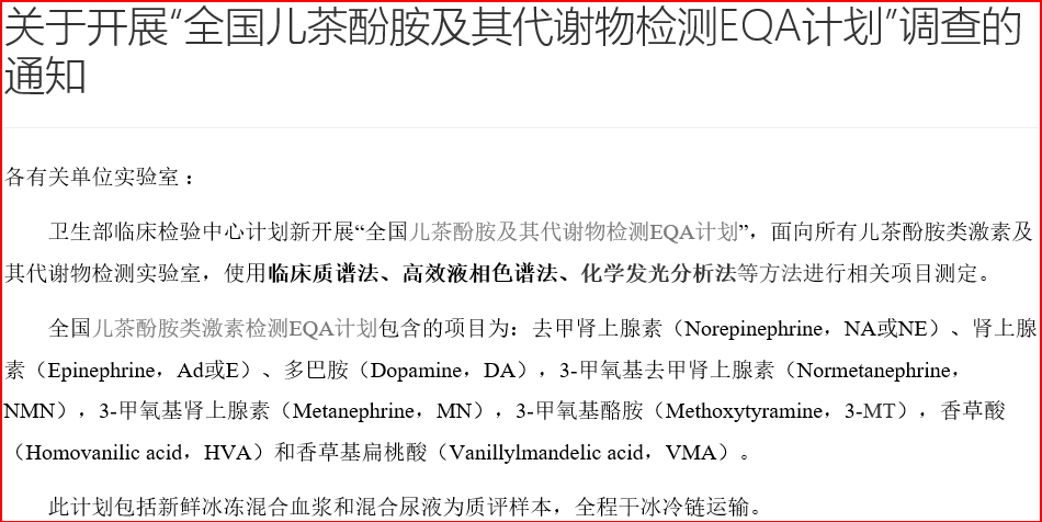 近年来,由于开展儿茶酚胺及其代谢物检测项目的实验室、第三方和医院等越来越多,为了确保检测方法的良好性能和临床有效性,国家卫生健康委临床检验中心于19年3月份首次开展了“全国儿茶酚胺及其代谢物检测EQA计划”。该EQA计划里面涉及的检测方法包含临床质谱法。